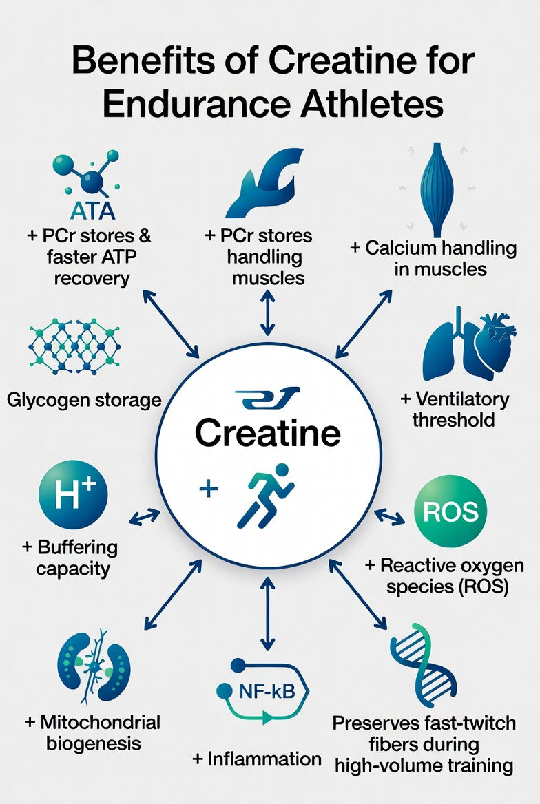 Creatine increases muscle phosphocreatine (PCr) stores, which rapidly regenerates ATP during high-intensity efforts. This improves power output, repeat sprint ability, recovery between intervals, and buffering of lactate.